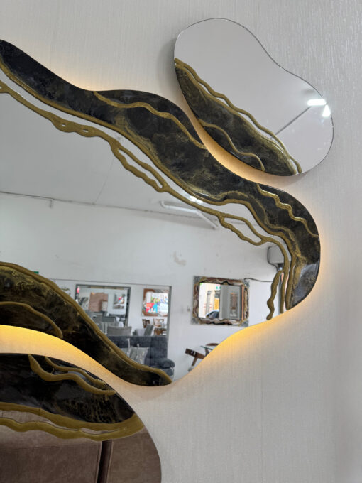 Descubre la majestuosidad del Espejo Empyreon, una obra que trasciende la decoración y se convierte en el punto focal de cualquier espacio. Su diseño irregular, acompañado de dos espejos complementarios, crea un juego visual único que captura miradas. Los elegantes detalles dorados contrastan con el negro profundo y el brillo plateado, evocando lujo y distinción.